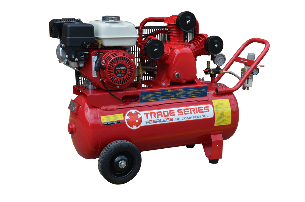 The TS20P Trade Series is a mid-tier Honda petrol air compressor, positioned below the P17 Honda petrol model in the Peerless lineup. Despite being mid-tier, it delivers a robust 325 liters per minute of free air at 100 PSI and is fitted with a 70L pressure vessel.